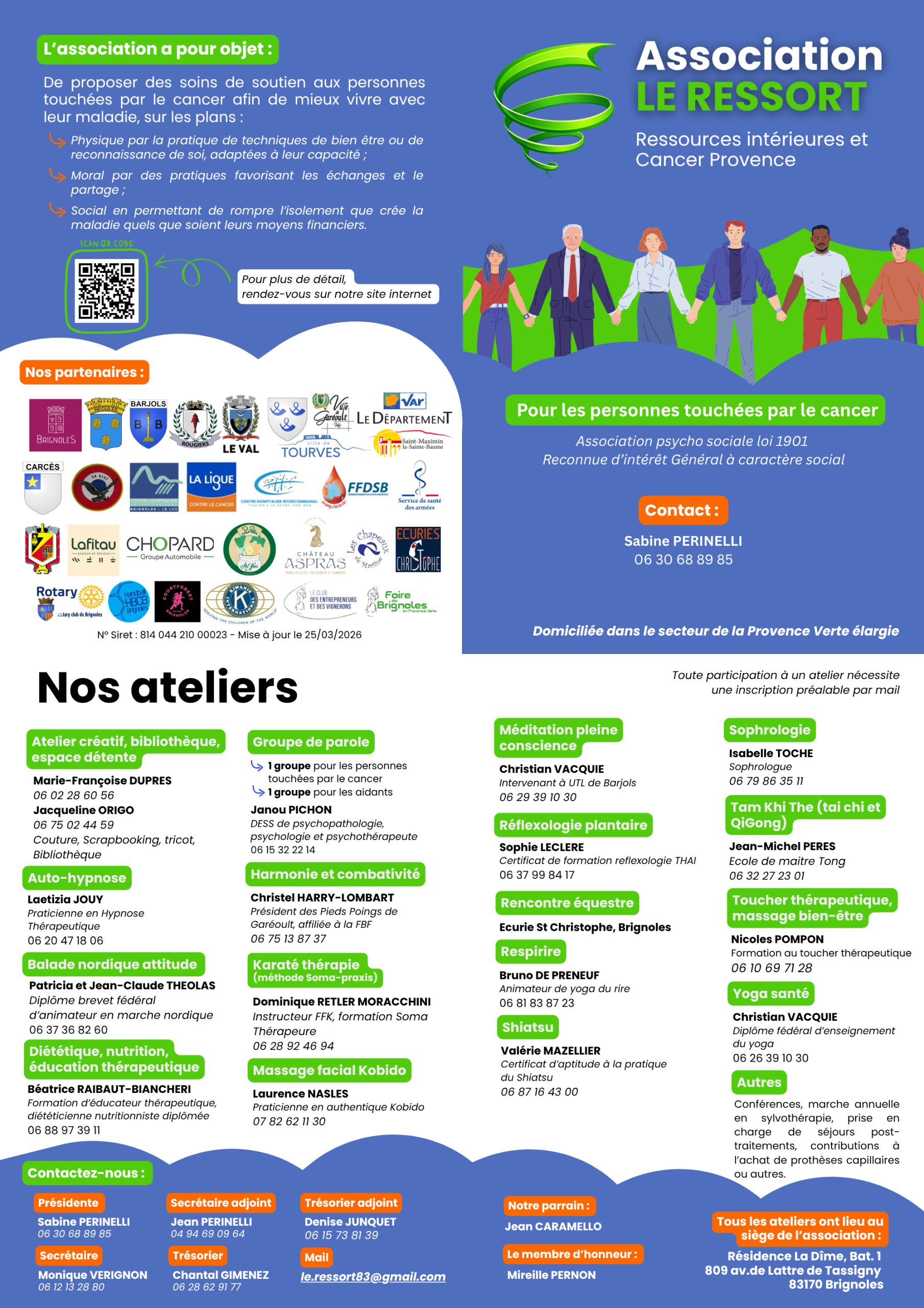 Voici les différentes activités proposées par l’association Le Ressort sur Brignoles pour un accompagnement dans le cadre d’un cancer. Tout est gratuit grâce à nos intervenants bénévoles! Pour notre accompagnement cancer, ne pas appeler les intervenants uniquement le numéro +33630688985. TOUS LES INTERVENANTS CONTRIBUENT BÉNÉVOLEMENT À LA VIE DE L’ASSOCIATION.
